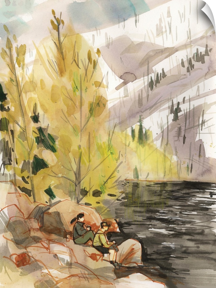 <p>Two hikers relax by Eighmile Lake on a cloudy day, near Leavenworth Washington in the Cascade mountains. The scene was captured using watercolor, pencils, and markers.</p>
