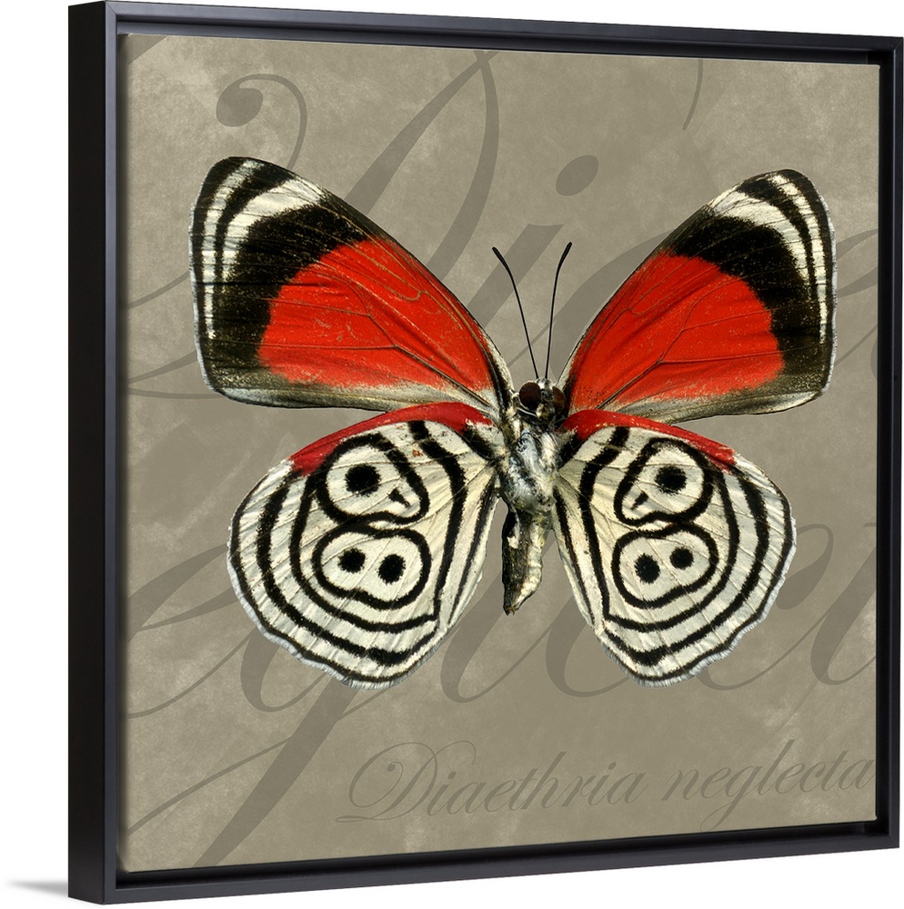 <p>Square home art docor on a large canvas of a vibrant, eighty-eight butterfly on a neutral background with large, script text. Smaller text below the butterfly reads "Diaethria neglecta".</p>