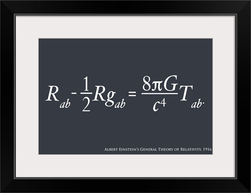 <p>Albert Einstein's equation for the General Theory of Relativity, on a slate grey background. General relativity generalises special relativity and Newton's law of universal gravitation, providing a unified description of gravity as a geometric property of space and time, or spacetime.</p>