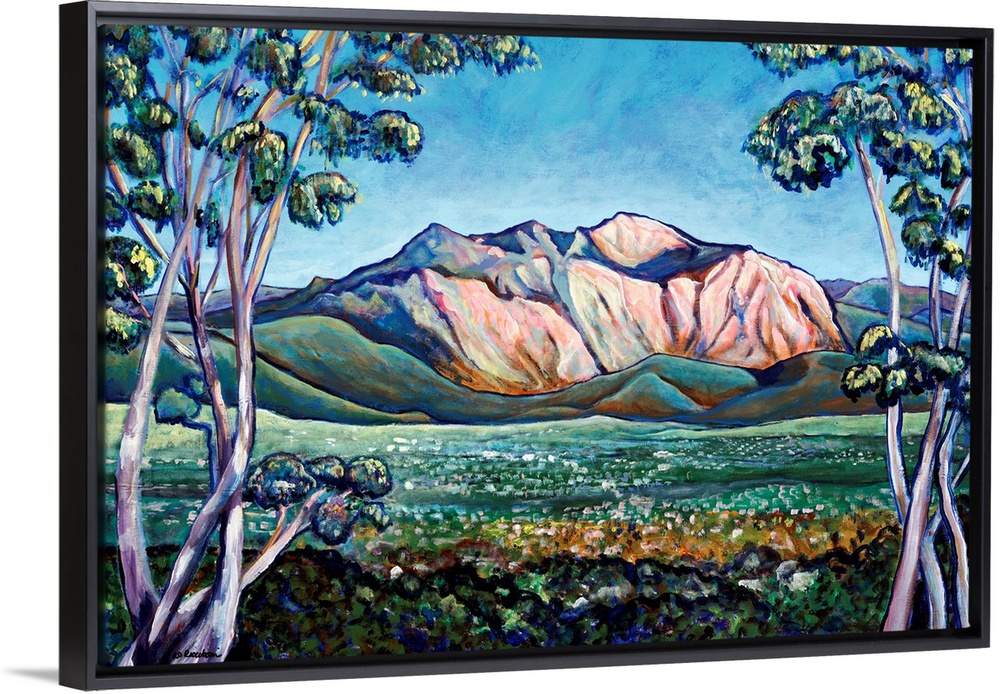 <p>Rugged El Capitian - El Cajon Mountain, landscape painting by San Diego California artist RD Riccoboni. Pink, Blue and green hues color the cliffs, valley and mountains framed by eucalyptus trees. The artist painted this scene from the park on the summit of Mt. Helix in La Mesa California looking north to the communities Lakeside and El Cajon.</p>