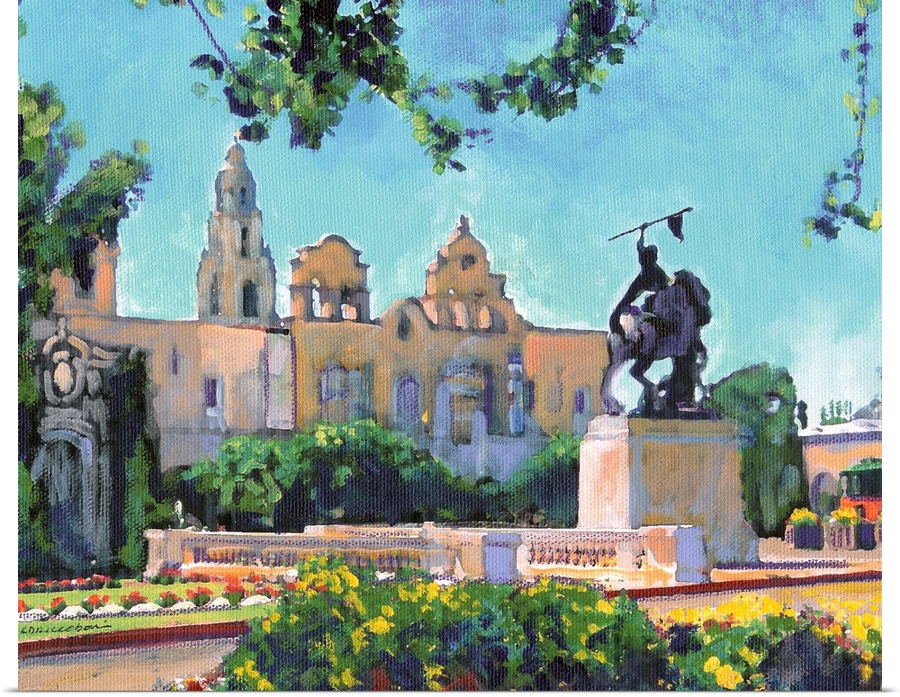 <p>Painting of El Cid Balboa Park in San Diego. Plaza de Panama with statue by Anna Hyatt Huntington. House of Charm building and California Bell Tower are seen to the left.</p>