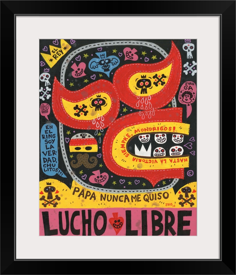 <p>Latin art of a luchador wearing a mask, decorated with hearts and skulls.</p>
