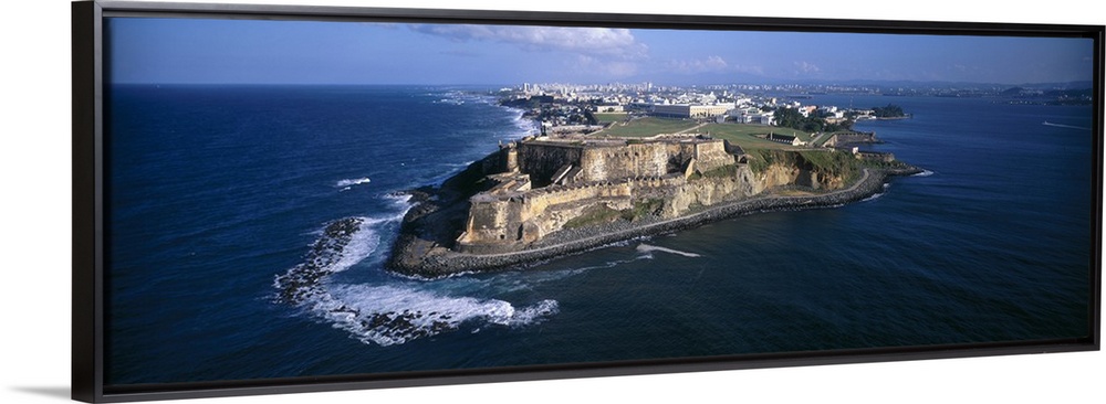 <p>Aerial panoramic shot of a land peninsula sticking out in to the ocean with a large stone fortress sitting on the cliffs.</p>