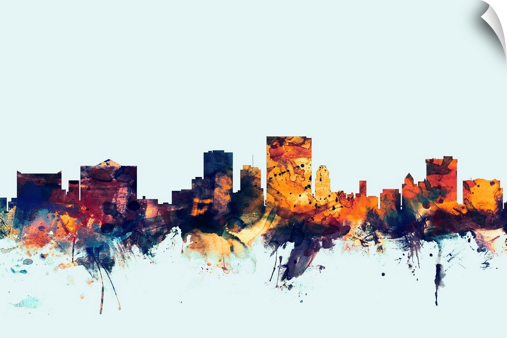 <p>Dark watercolor silhouette of the El Paso city skyline against a light blue background.</p>
