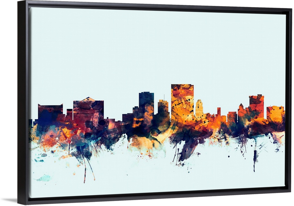 <p>Dark watercolor silhouette of the El Paso city skyline against a light blue background.</p>