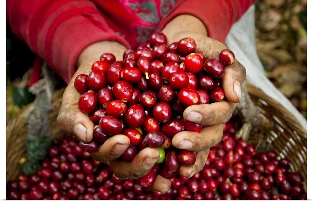 <p>El Salvador, Coffee Pickers, Hands Full Of Coffee Cherries, Coffee Farm, Slopes Of The Santa Volcano, Finca Malacara, High Altitude Coffee</p>