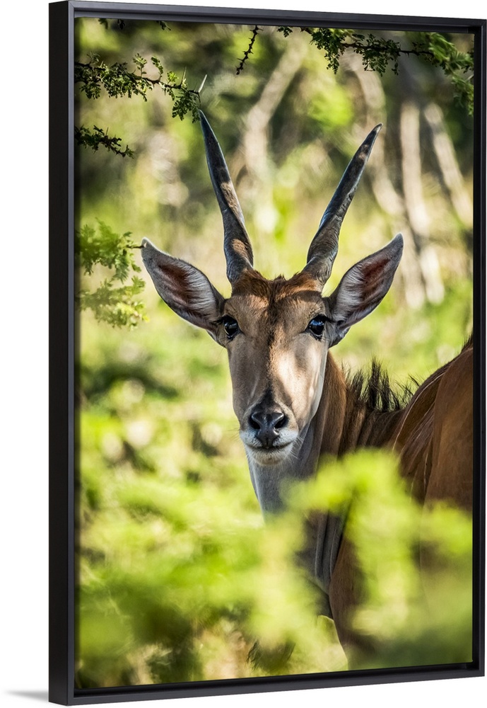 <p>Close-up of eland (Taurotragus oryx) eyeing camera through foliage, Serengeti; Tanzania</p>
