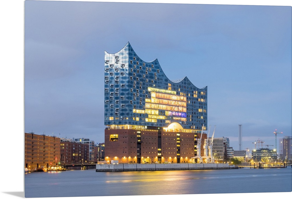 <p>Germany, Hamburg, HafenCity. Elbphilharmonie (Elbe Philharmonic Hall) concert hall on the Elbe River at dusk.</p>