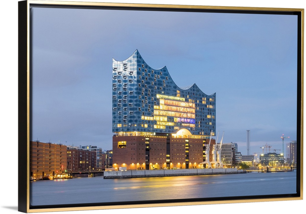 <p>Germany, Hamburg, HafenCity. Elbphilharmonie (Elbe Philharmonic Hall) concert hall on the Elbe River at dusk.</p>