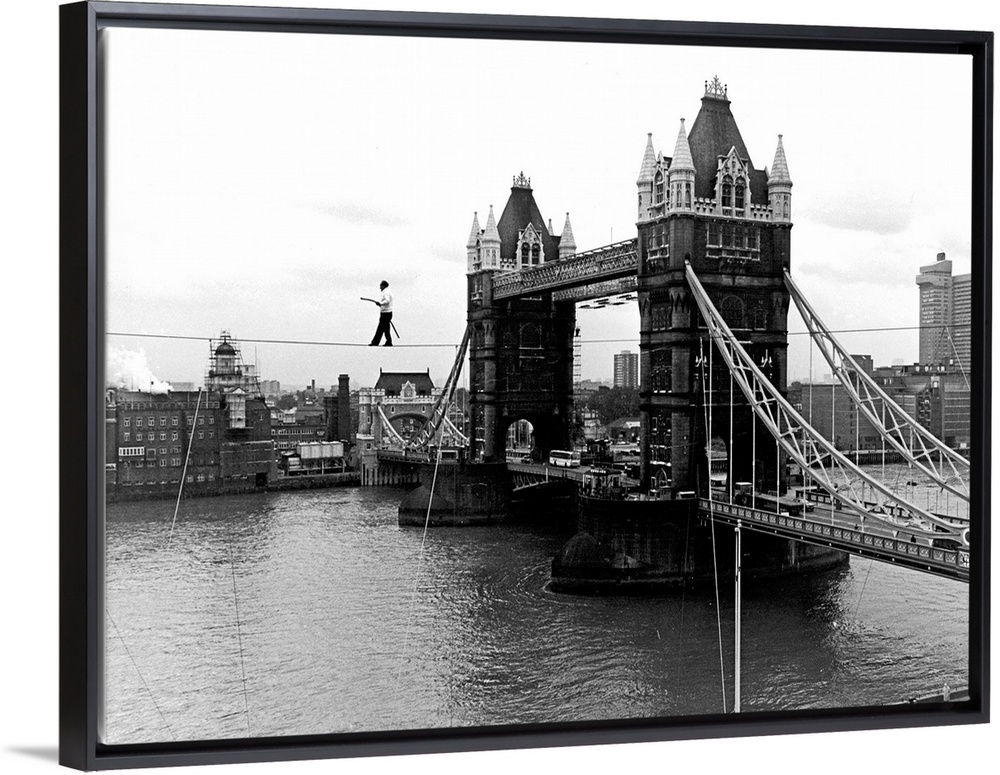 <p>German high wire performer Karl Wallenda, aged 71, walks across a 120-yard cable over the Thames River near Tower Bridge, London, England, November 23, 1976 Halfway across he stopped and stood on his head</p>
