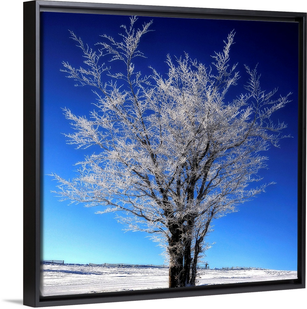 <p>A frozen tree in winter in front of a blue sky</p>