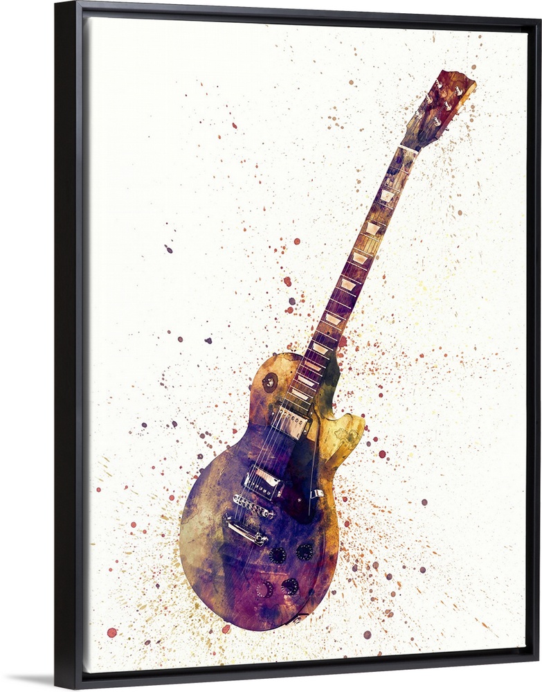 <p>Contemporary artwork of an electric guitar with bright colorful watercolor paint splatter all over it.</p>