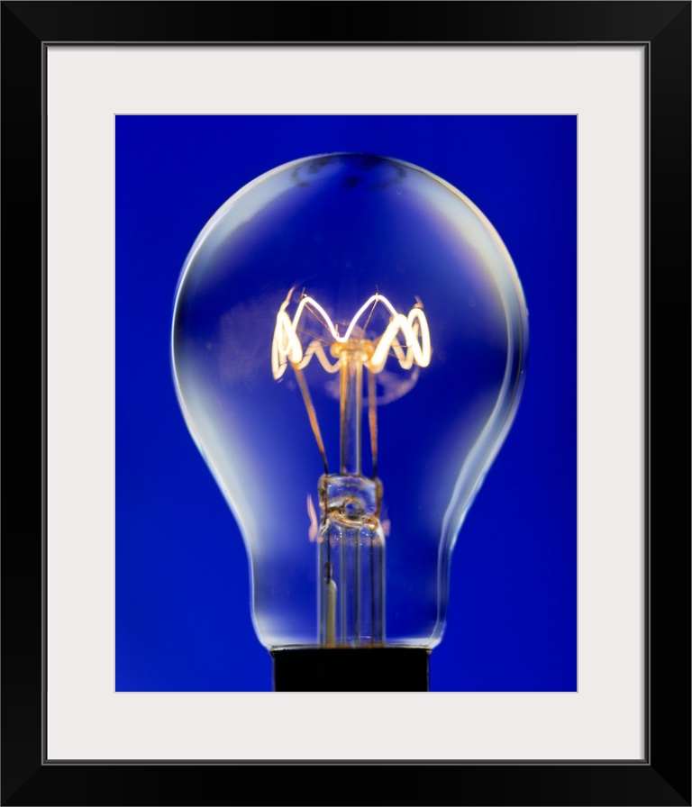 <p>Electric light bulb. Light bulbs produce light from a filament (centre), a fine coiled wire of tungsten, which heats up and glows as an electric current is passed through it. Tungsten is used due to its strength and high melting point (3410 degrees Celsius). The interior of the bulb contains an inert gas, usually a mixture of nitrogen and argon. Air cannot be used as the oxygen it contains would cause the tungsten to burn up immediately. Whilst in use, the tungsten filament gradually evaporates until eventually it breaks and the bulb must be replaced.</p>