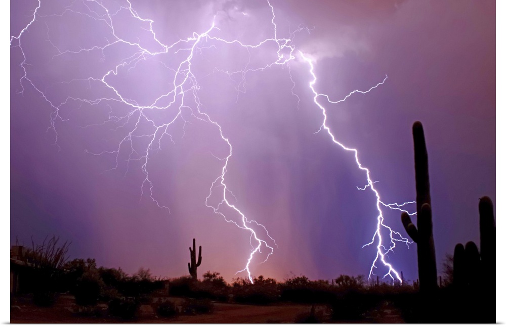 <p>Photograph of lightning bolts in a purple sky with a desert silhouette in the foreground.</p>