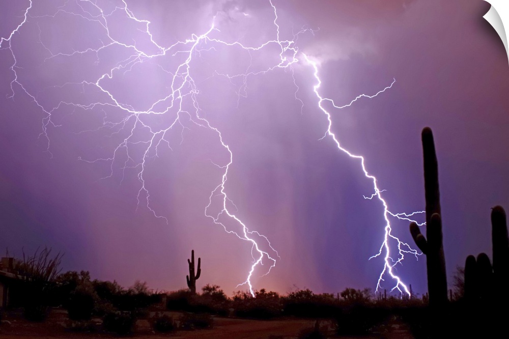 <p>Photograph of lightning bolts in a purple sky with a desert silhouette in the foreground.</p>