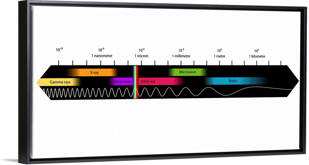 <p>Electromagnetic spectrum, computer artwork. The changing wavelength of electromagnetic (EM) radiation through the spectrum is shown by the trace along bottom. The corresponding frequencies in meters are shown along top. At the low wavelength end (right) of the EM spectrum are radio waves, microwaves and infrared radiation. At the high wavelength end (left) of the spectrum are gamma rays, X-rays and ultraviolet light. Visible light, at centre right, is a mid-frequency range of wavelengths that can be seen by the human eye.</p>