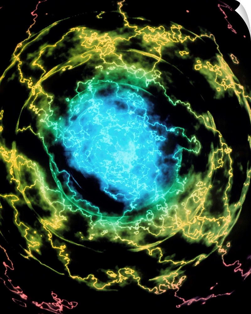 <p>Electron density of a helium atom. This image represents the quantum cloud of electrons surrounding a helium atom. The colours represent the local electric charge density, essentially the probability that one might find one of the atom's four electrons at a given point. The colours run from blue (highest) to red (lowest). The chaotic appearance of the image is due to the presence of a nearby charged particle; when in equilibrium the atom would appear more symmetrical. This is a more appropriate image than the older ideas of fixed 'orbitals' for electrons, sometimes referred to as the Bohr Model, and is due to the principles of modern quantum theory.</p>