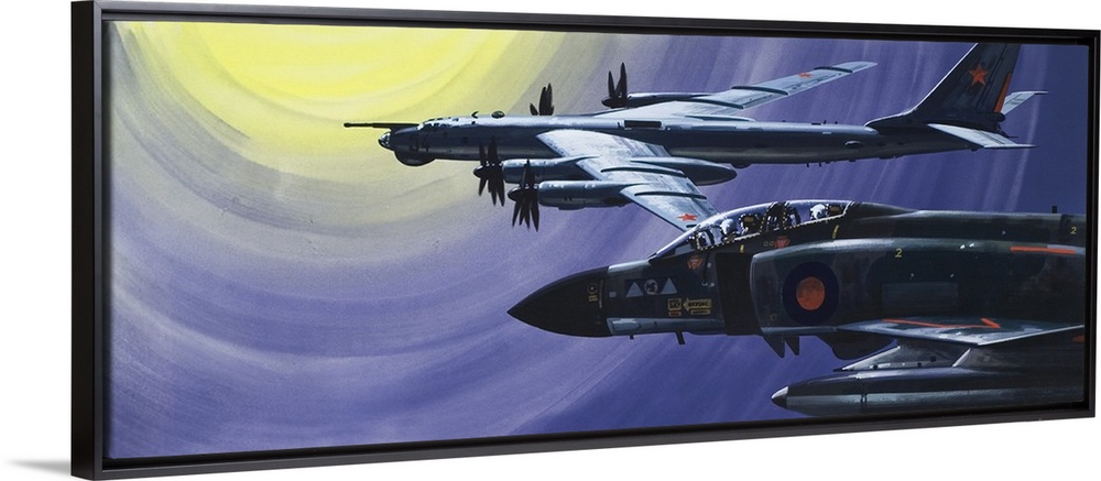 <p>Electronic Battle. High up and far out over the North Sea, an RAF Phantom of Strike Command pulls in close to a Russian Tupolev Tu-95D reconnaissance aircraft with the NATO code-name of "Bear".</p>