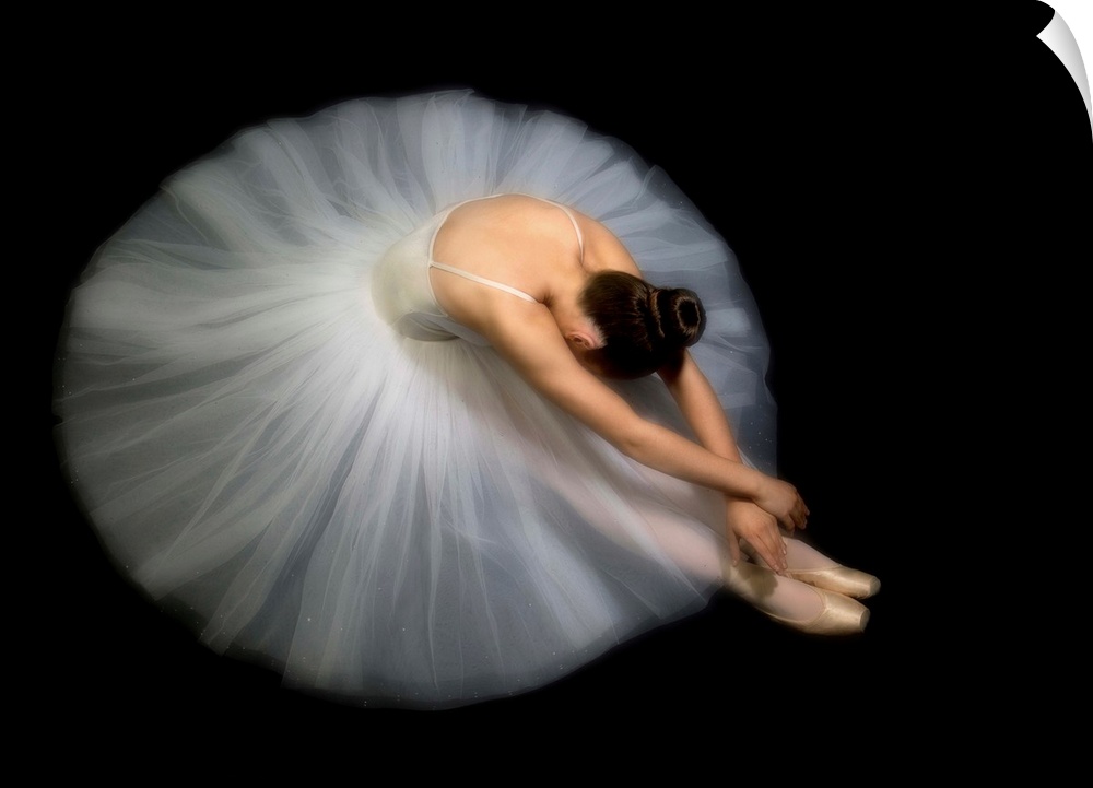<p>A ballerina sits and leans over, her hands touching her shoes.</p>