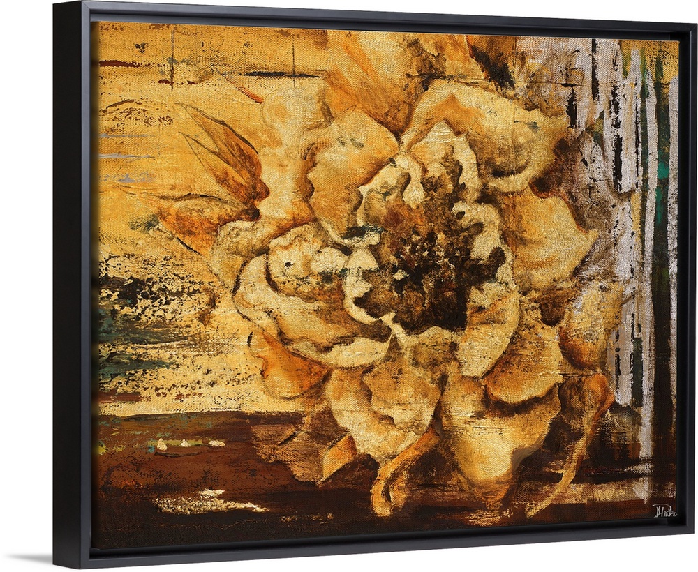 <p>Painting of a rustic golden flower against an abstract background in gold.</p>