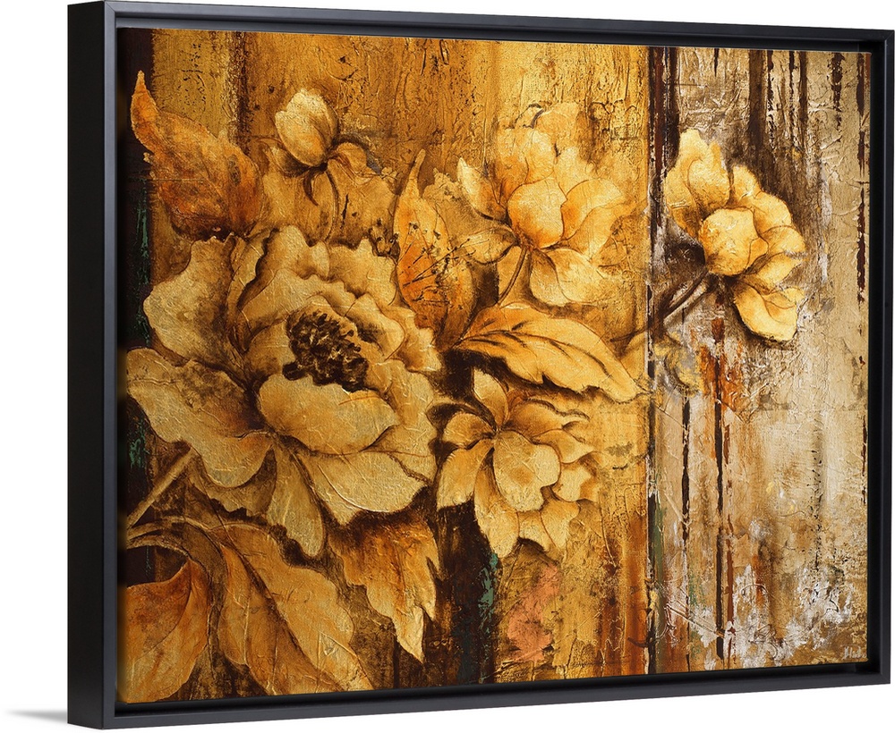 <p>Painting of rustic golden flowers against an abstract background in gold.</p>