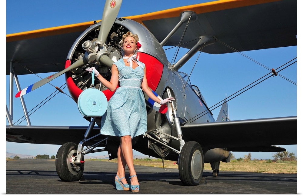 <p>Elegant 1940's style pin-up girl standing in front of an F3F biplane.</p>