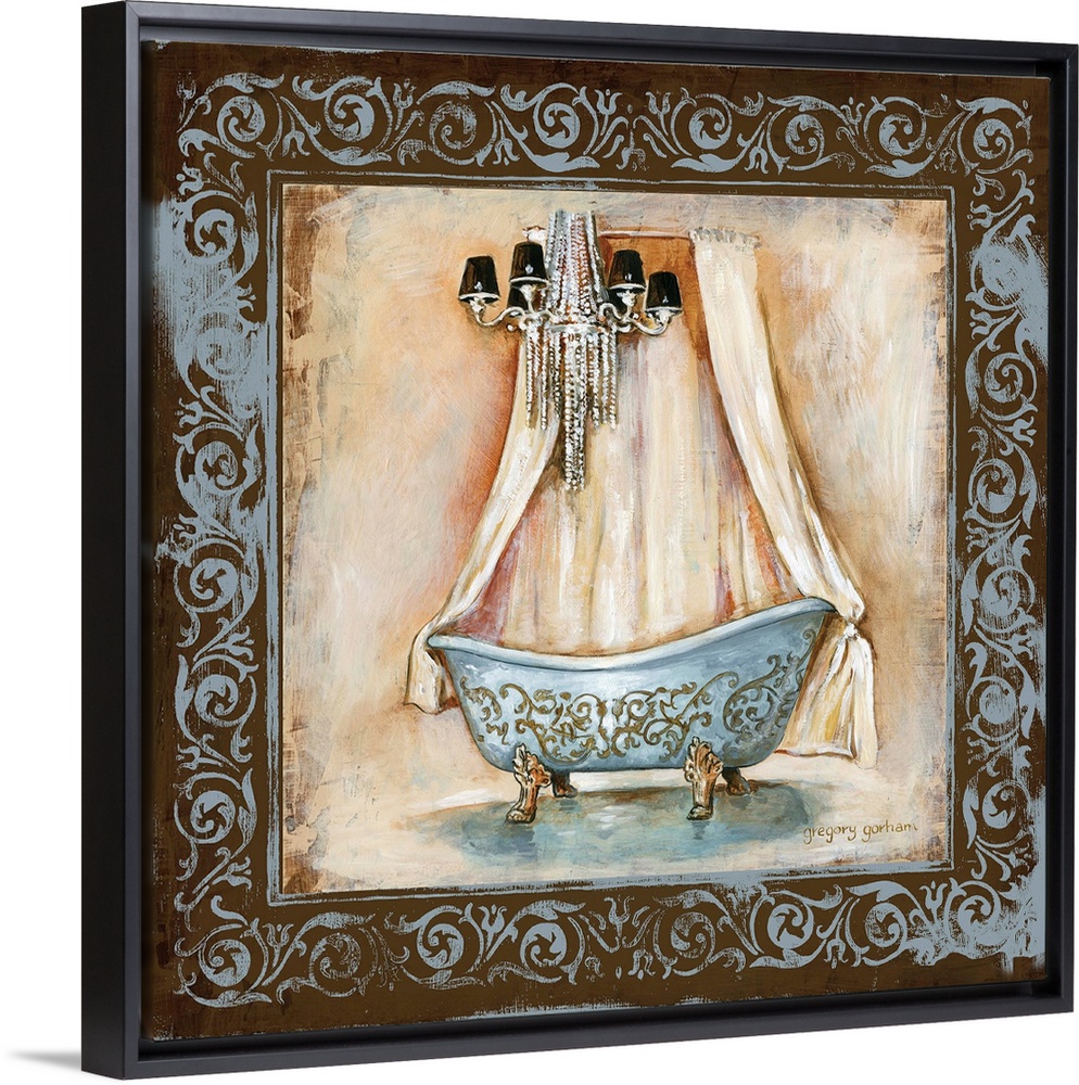<p>Square bathroom decor that has a painting of a beautiful clawfoot tub with a chandelier above inside an antique brown and powder blue designed frame.</p>