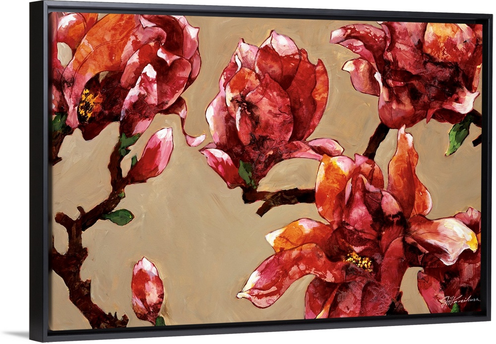 <p>Contemporary painting of a group of red magnolias against a neutral backdrop.</p>