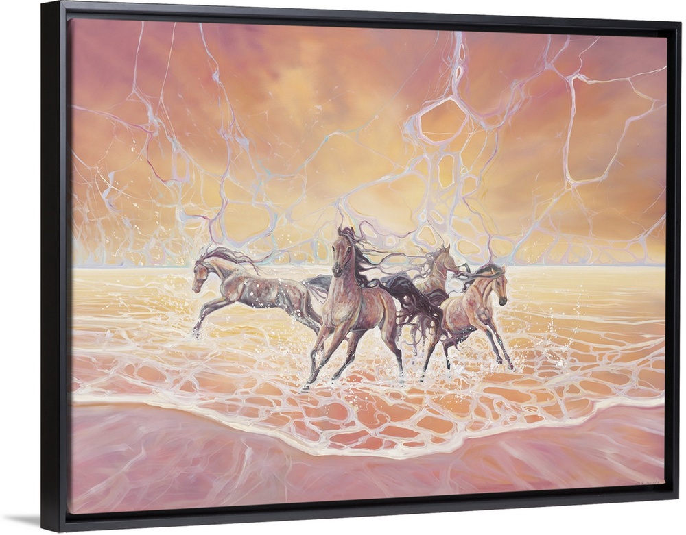 <p>Painting of a group of horses running out of waves of an ocean.</p>