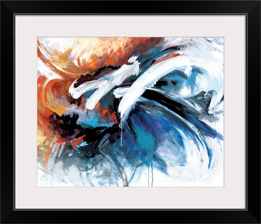 <p>A contemporary abstract painting using tones of blue red and orange in a cloud-like formation of color.</p>