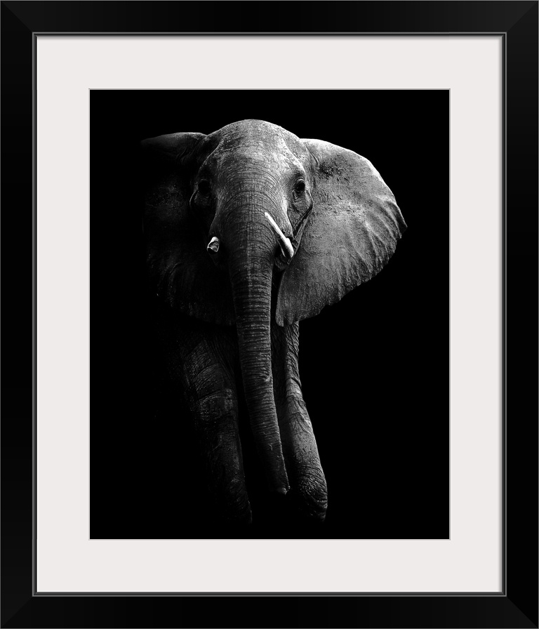 <p>Low-key photograph of an elephant on a black background, highlighting the rough, wrinkly texture of its skin.</p>