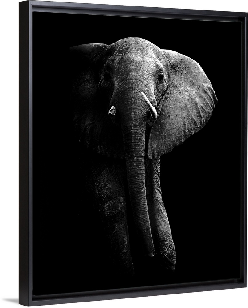 <p>Low-key photograph of an elephant on a black background, highlighting the rough, wrinkly texture of its skin.</p>