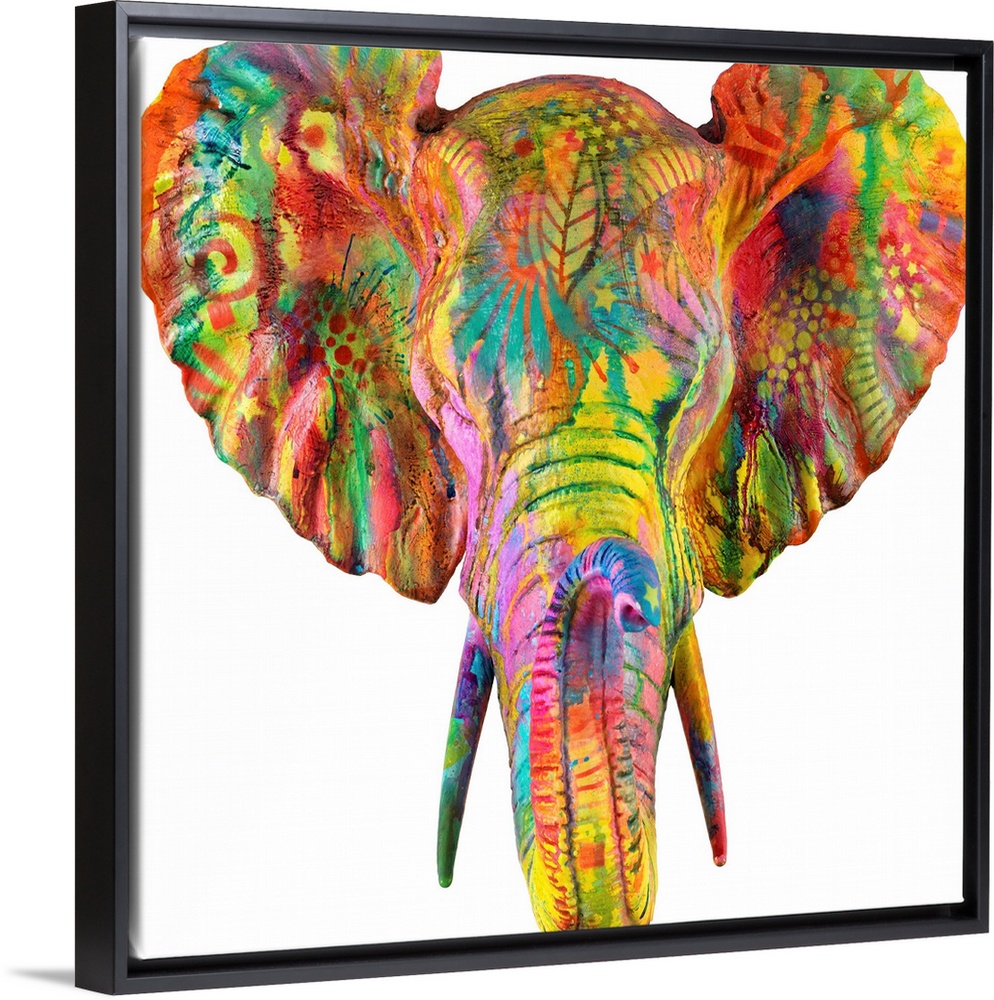 <p>Colorful painting of an elephant's head and tusk covered in abstract designs on a sold white background.</p>
