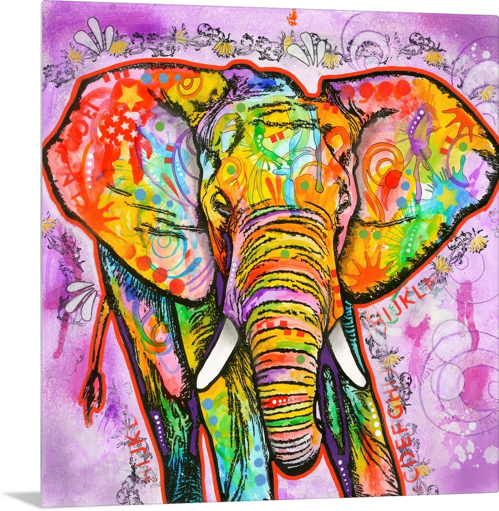 <p>Square painting of a colorful elephant with abstract markings on a busy purple background.</p>
