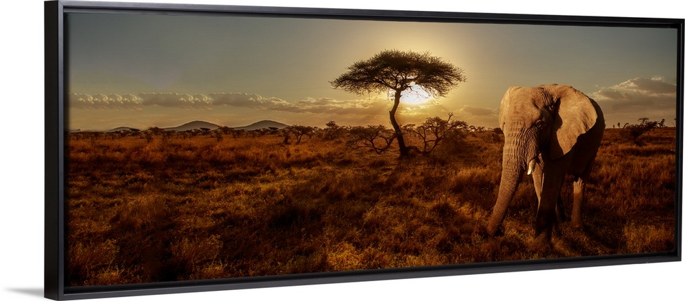 <p>A panoramic photograph of an elephant walking near a tree in the savanna.</p>