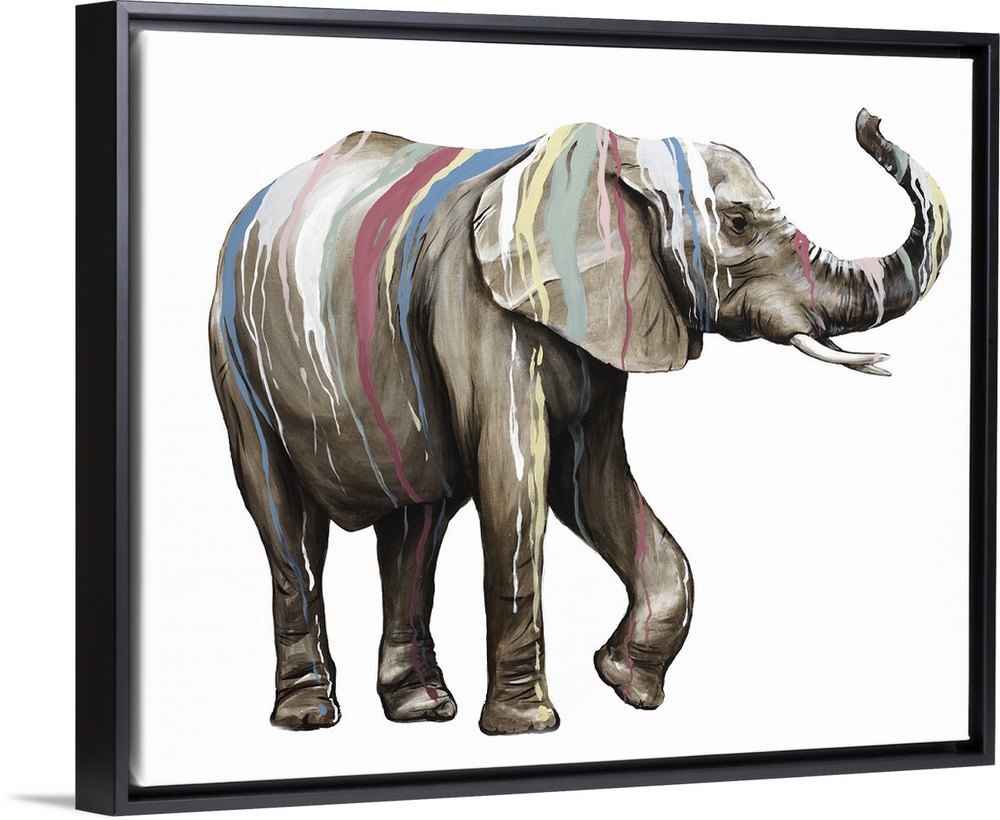 <p>Artwork of an elephant covered with multiple colors of paint dripping down it's body.</p>