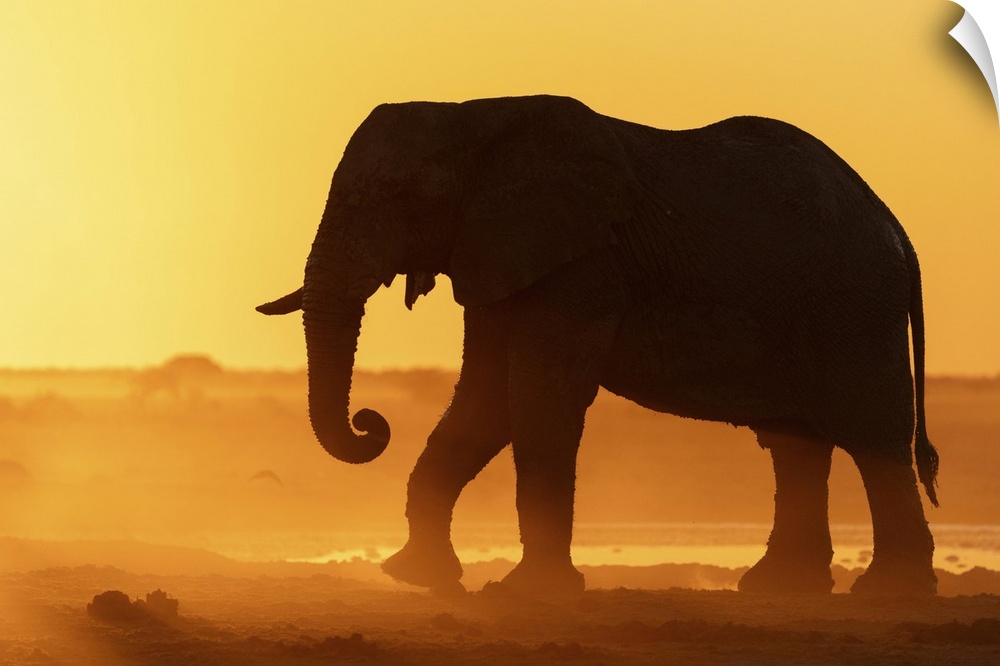 <p>Elephant in a dusty golden sunset at a waterhole, Nxai Pan National Park, Botswana.</p>