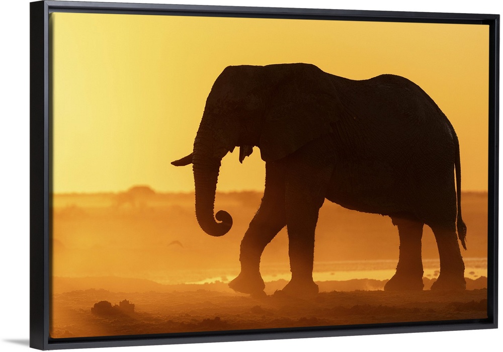 <p>Elephant in a dusty golden sunset at a waterhole, Nxai Pan National Park, Botswana.</p>