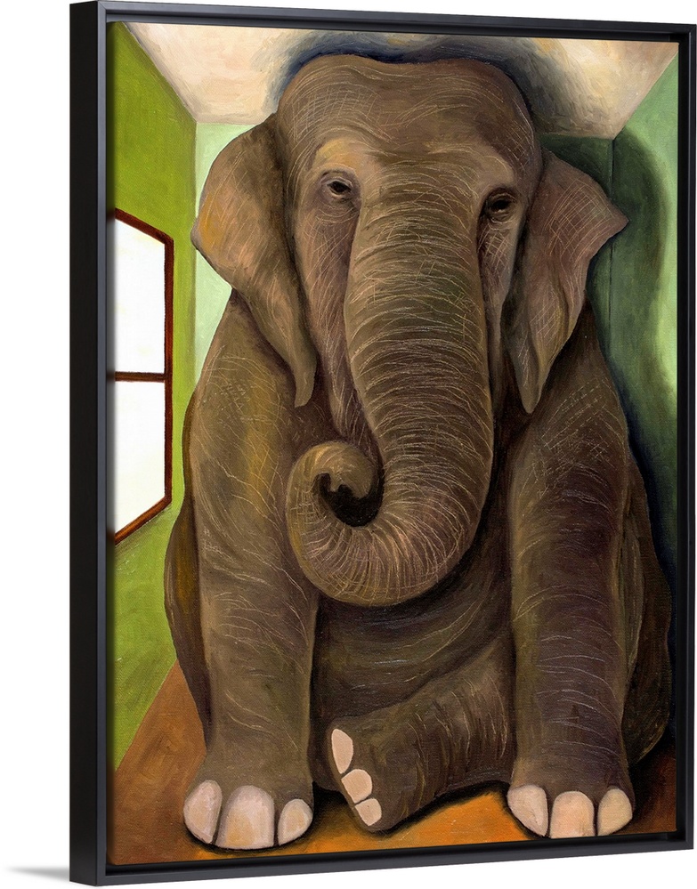 <p>Surrealist painting of a large elephant sitting in tiny room.</p>