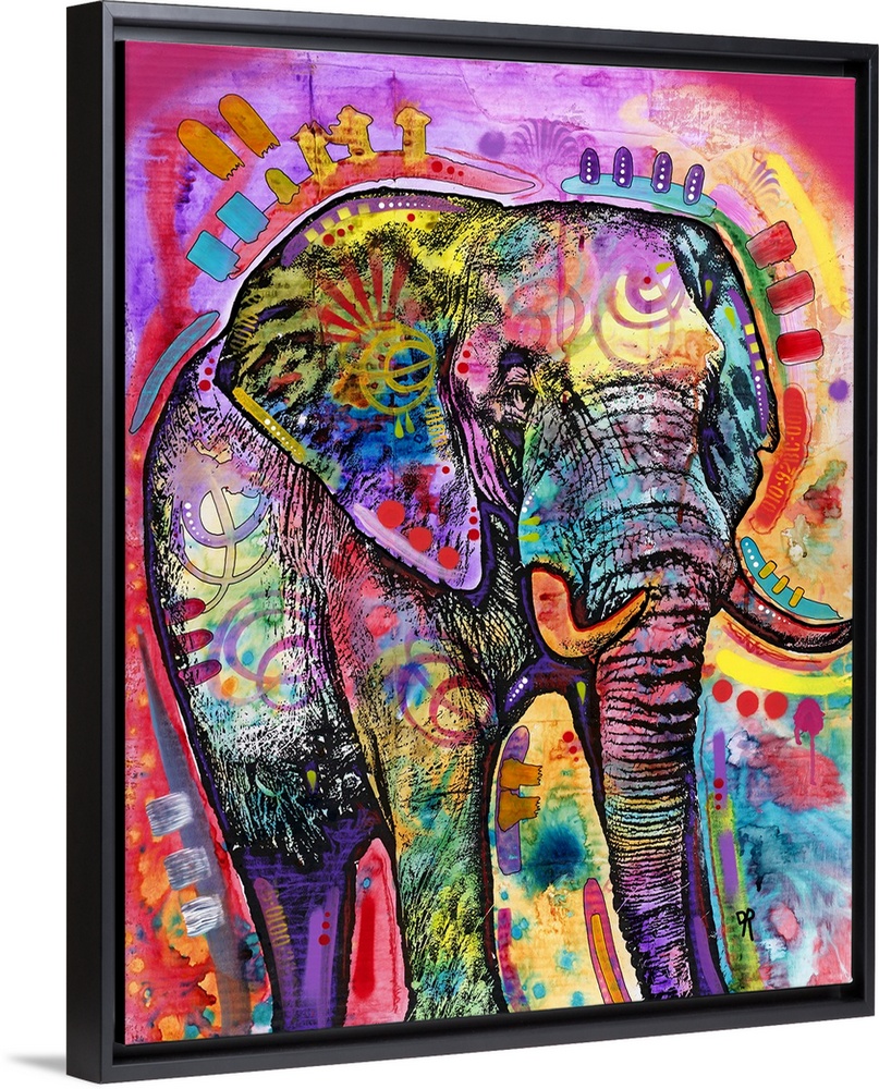 <p>Colorful illustration of a large elephant with abstract markings all over.</p>