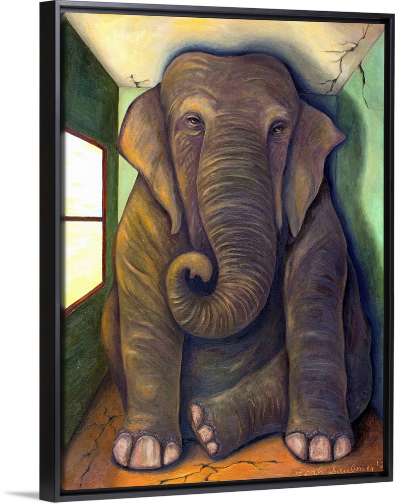 <p>Surrealist painting of a large elephant sitting in tiny room.</p>