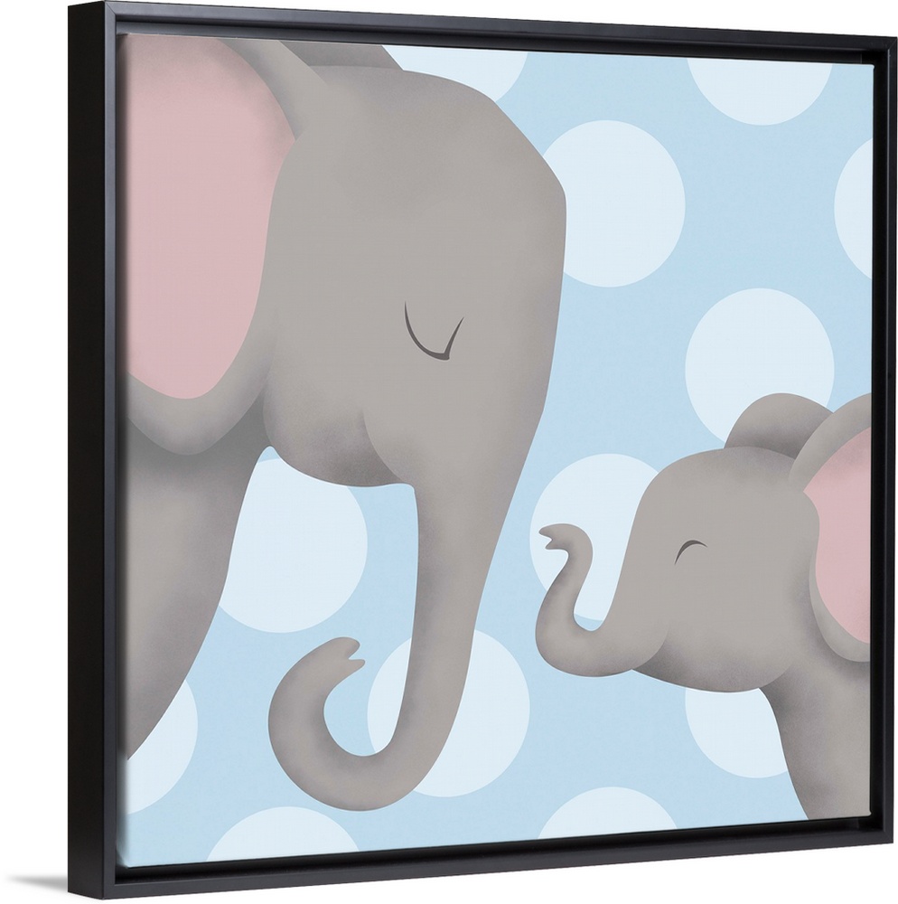 <p>Nursery art of a mother elephant and her baby on a blue polka-dot background.</p>