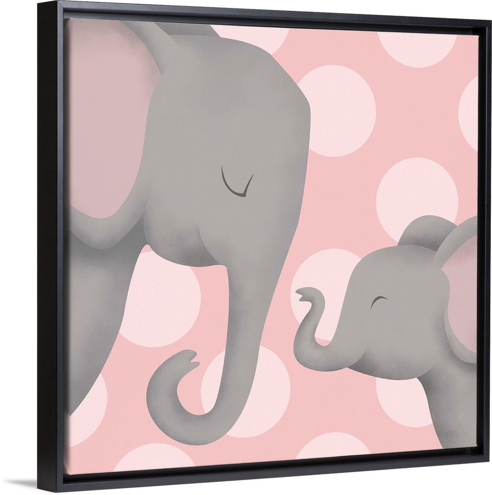 <p>Nursery art of a mother elephant and her baby on a pink polka-dot background.</p>