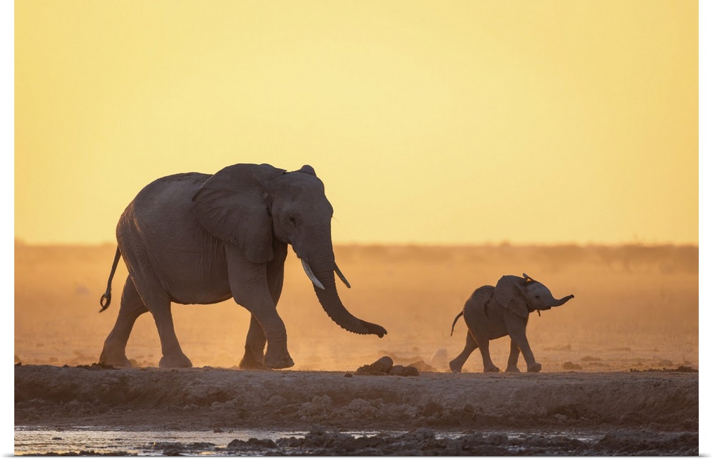 <p>Elephant mother and calf walking in a dusty golden sunset at a waterhole, Nxai Pan National Park, Botswana.</p>