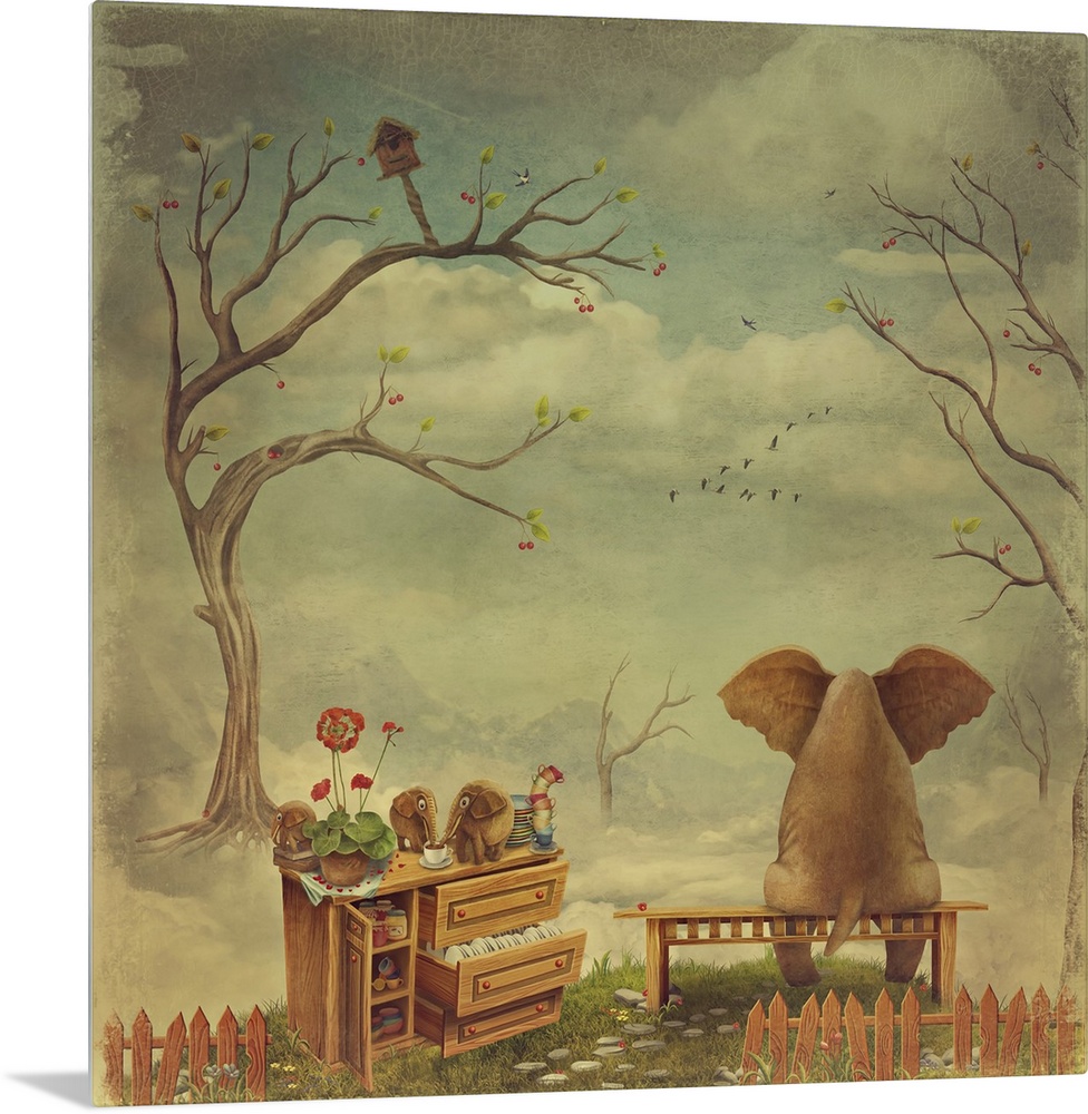 <p>Pensive elephant sits on a bench in the sky.</p>