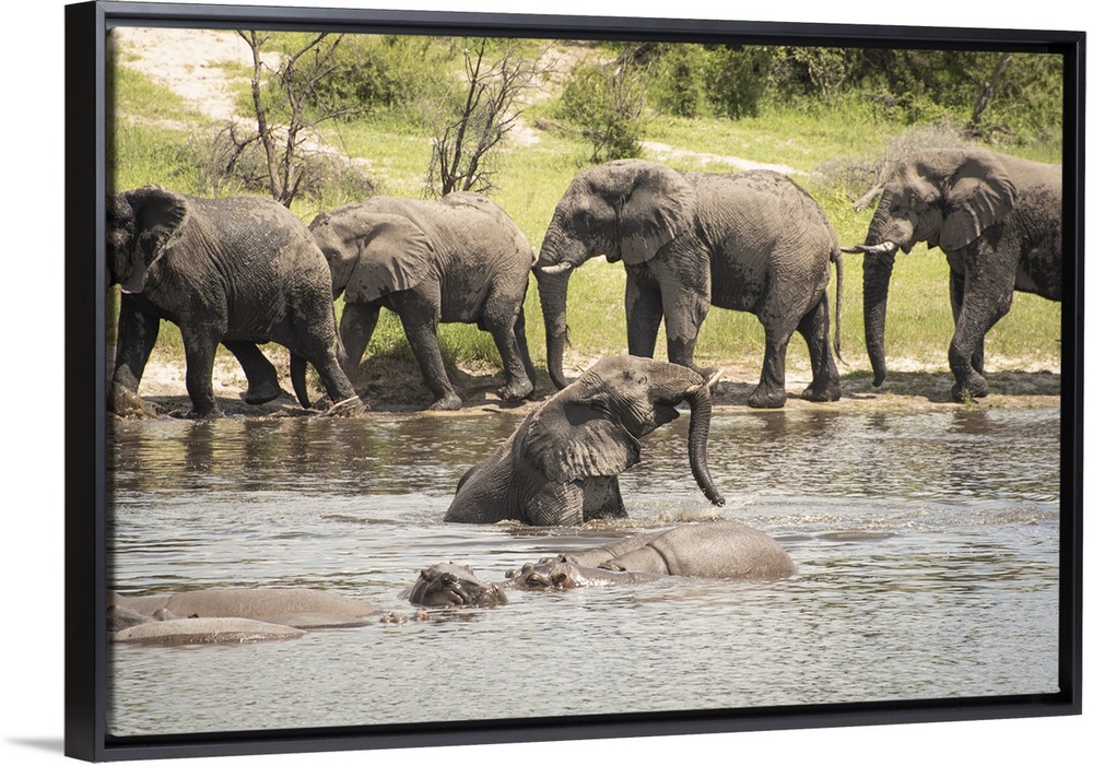<p>Elephant splashes around with the hippos to keep cool.</p>