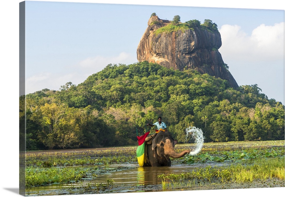<p>Elephant ride with Lion Rock, Ancient Rock Fortress behind, Sigiriya, Sri Lanka.</p>