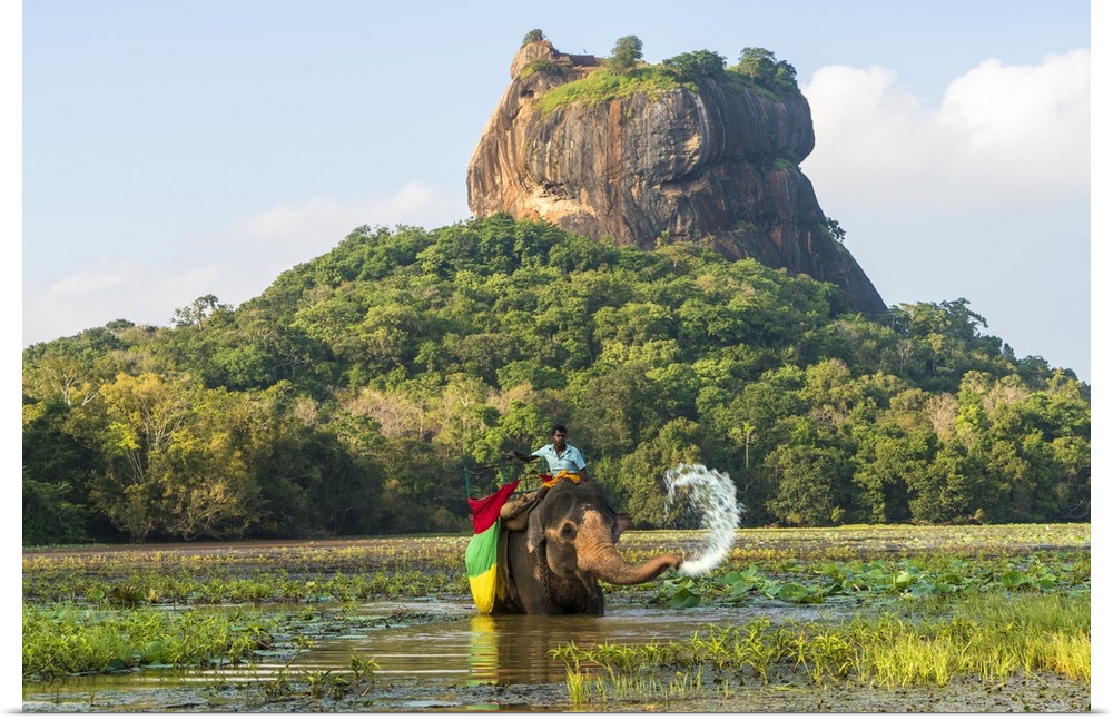 <p>Elephant ride with Lion Rock, Ancient Rock Fortress behind, Sigiriya, Sri Lanka.</p>