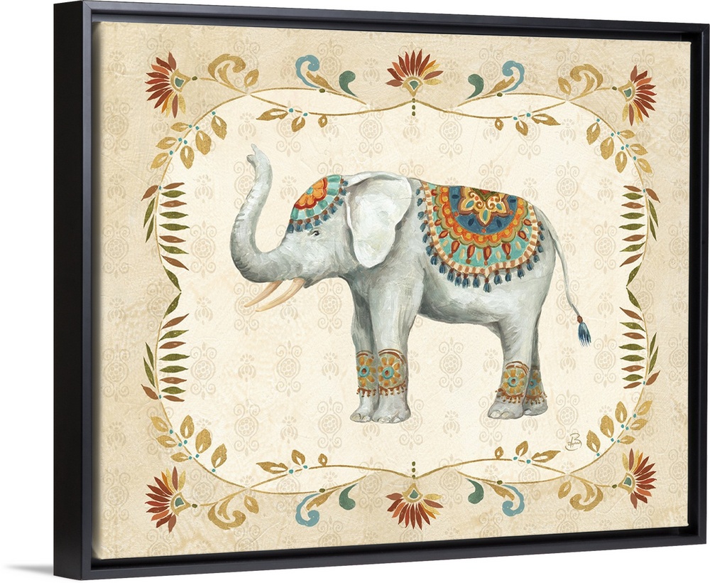 <p>Boho style painting of an elephant with a floral design on a neutral colored background.</p>