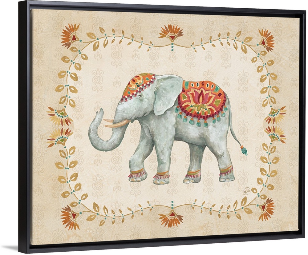 <p>Boho style painting of an elephant with a floral design on a neutral colored background.</p>